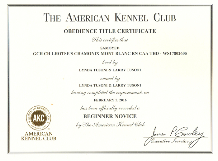 Chamonix finished her Beginners Novice Obedience with scores of 188, 194 1/2, 194 1/2 and a 4th place and 3rd place!