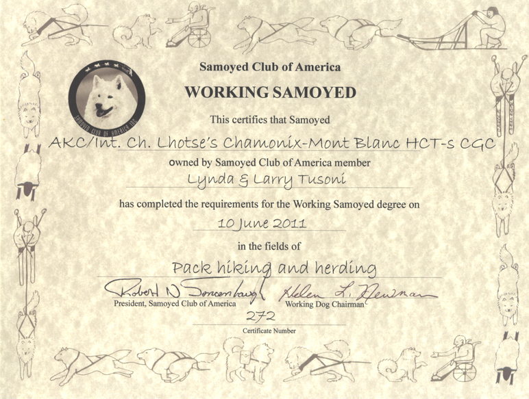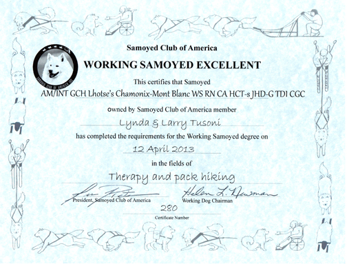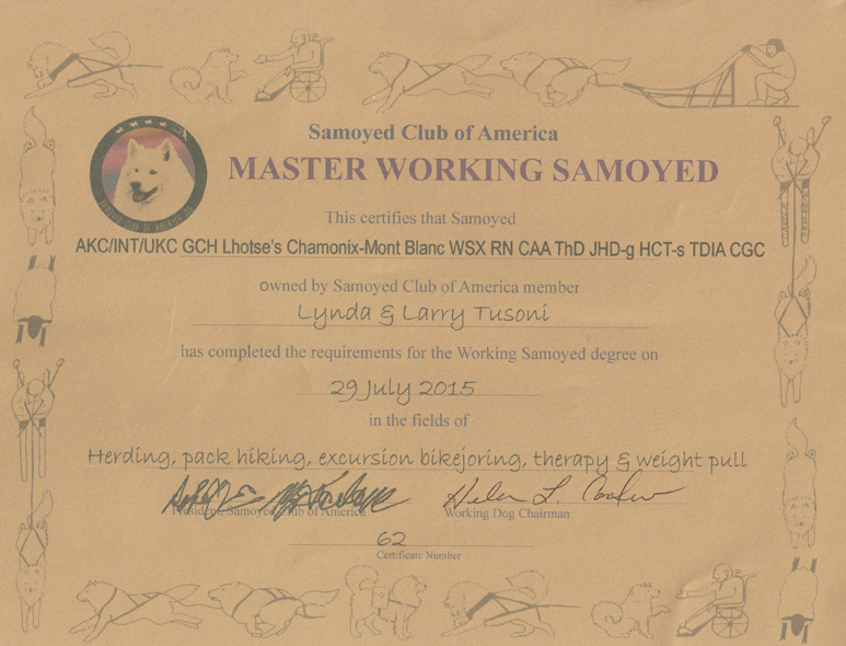 July 2015 - Chamonix earns her Master Samoyed Working Title (WSXM)! I am so proud of the work my 9 year old continues to do with me!